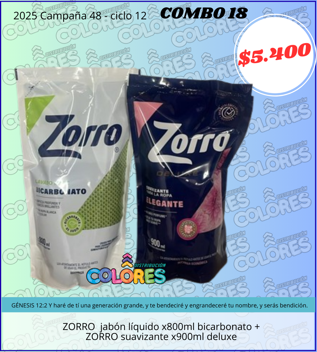 COMBO 18 – ZORRO JABÓN LÍQUIDO x800ml BICARBONATO + ZORRO SUAVIZANTE x900ml DELUXE