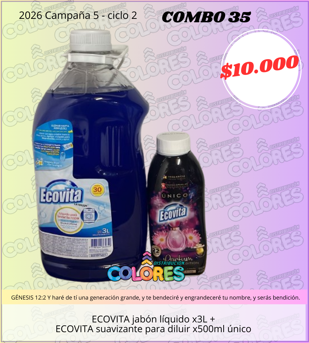 COMBO 35 – ECOVITA JABÓN LÍQUIDO x3L + ECOVITA SUAVIZANTE PARA DILUIR x500ml ÚNICO